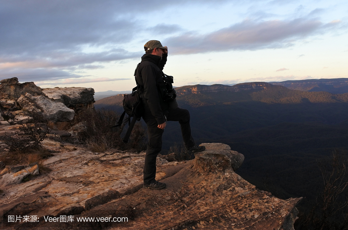 在澳大利亚新南威尔士州蓝山的格罗斯山谷日出时,人们从林肯岩石瞭望台观看风景